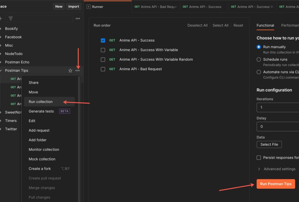 To run the tests click on the ellipsis of the collection on the left panel, select “Run collection“, and finally click the “Run” button.