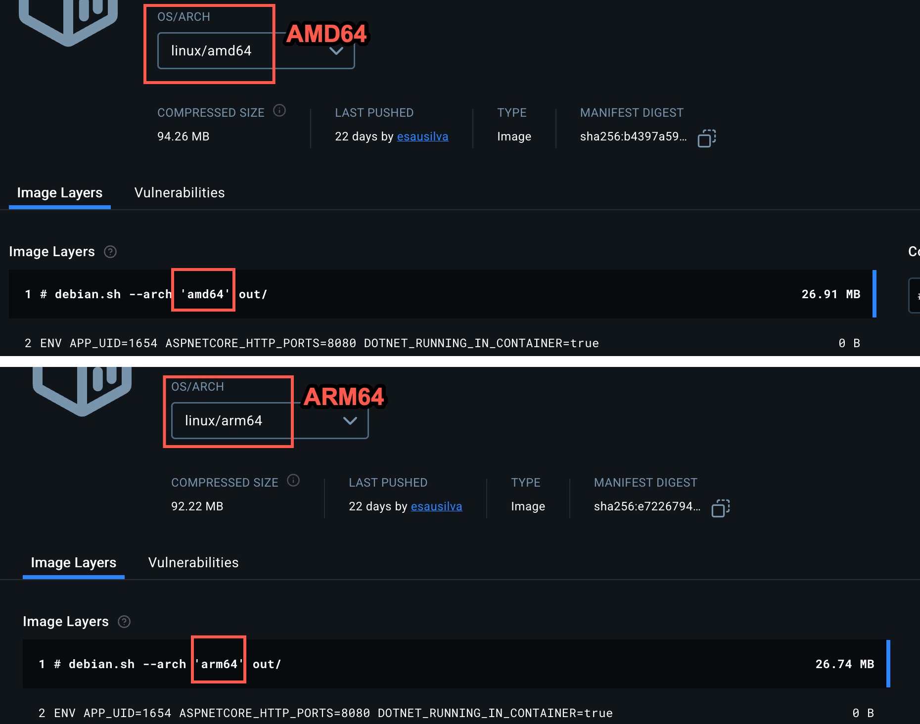 The difference between the .NET Core API and the Next.js images? Well, the .NET Core API successfully built for the correct platforms and architecture.
