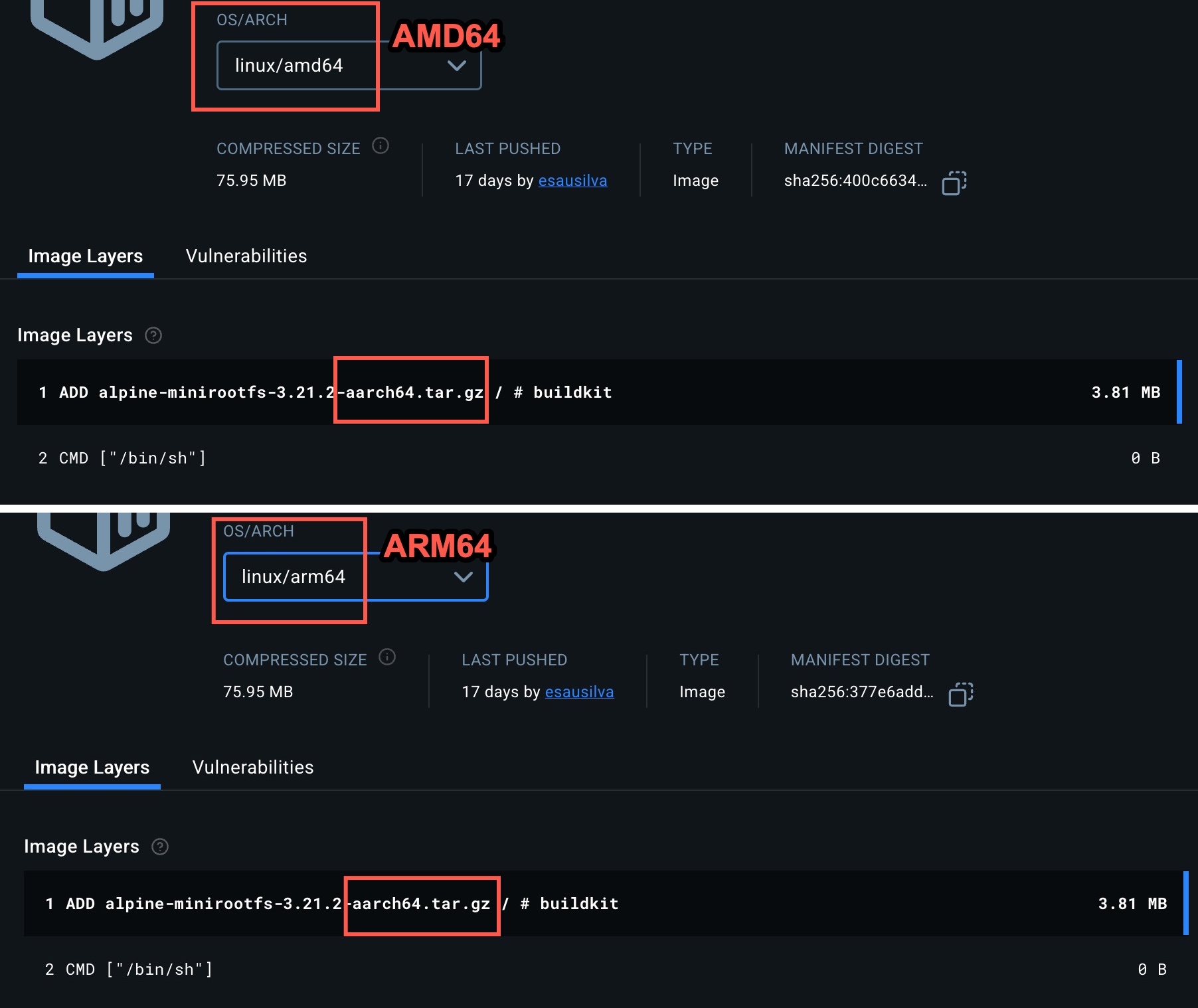 While inspecting the images in Docker Hub, I noticed the two OS architectures were correct. However, the image itself was still built for with ARM architecture.